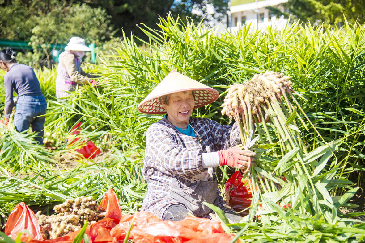 11月5日,温泉镇榆树村,村民在采收、打包“订单生姜”,供应市场。